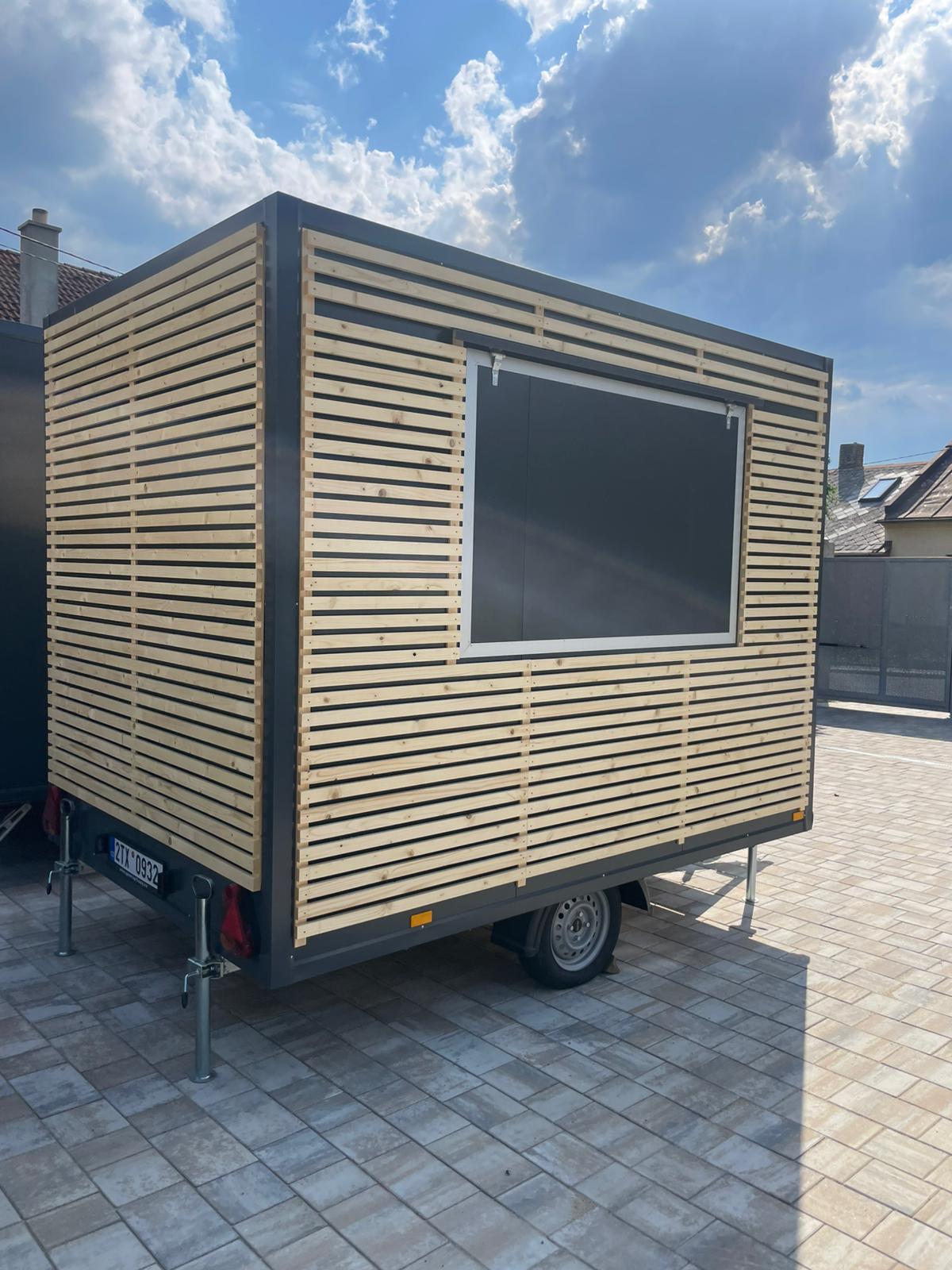 Moderní gastro přívěs s dřevěným obložením k pronájmu. Ideální řešení pro street food, festivaly, trhy i sezónní prodej.